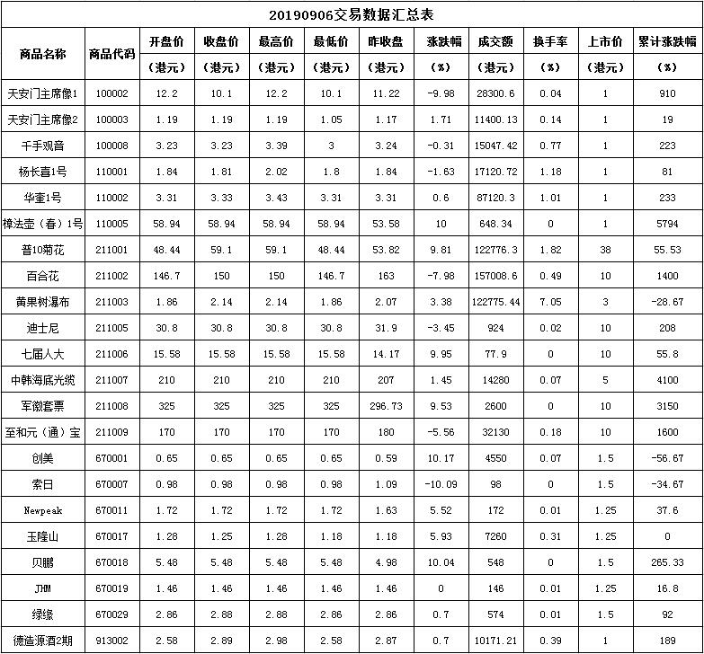 香港文匯交易所20190906交易数据汇总表