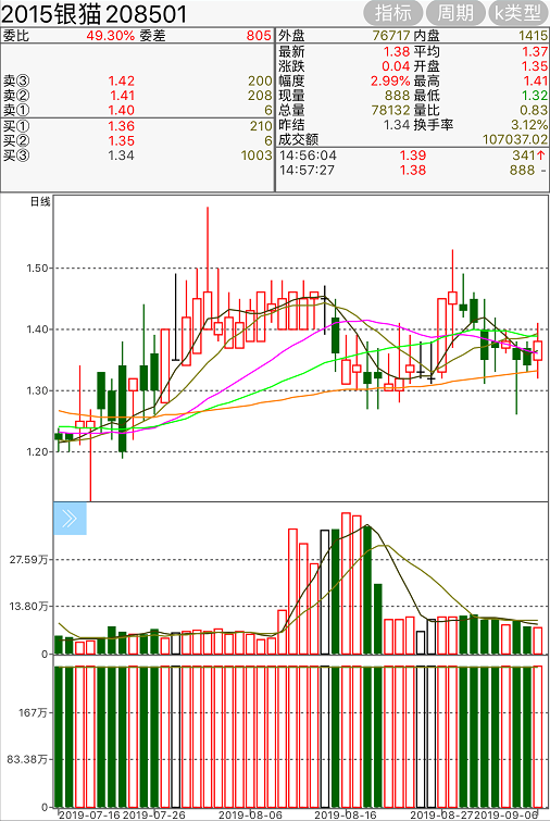 《2015銀貓》該票盤中轉換,近期走勢健康,或有回調。尾盤收於1.38元,上漲2.99%。建議持續關注。