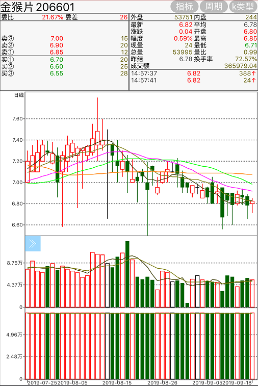《金猴片》該票長達兩月橫盤築底,近期明顯表現出吸籌狀態,近期或出現反轉行情。尾盤收於6.82元,上漲0.59%。建議重點關注。