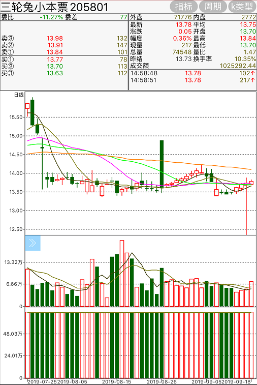 《三輪兔小本票》該票今日區間震盪,可重點關注,伺機而動。尾盤收於13.78元,上漲0.36%。建議切勿盲目抄底。