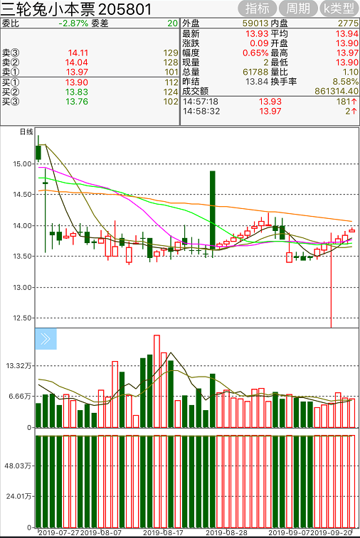 《三輪兔小本票》該票今日區間震盪,且長時間橫盤築底,期待後期沖高。尾盤收於13.93元,上漲0.65%。建議逢低進場。