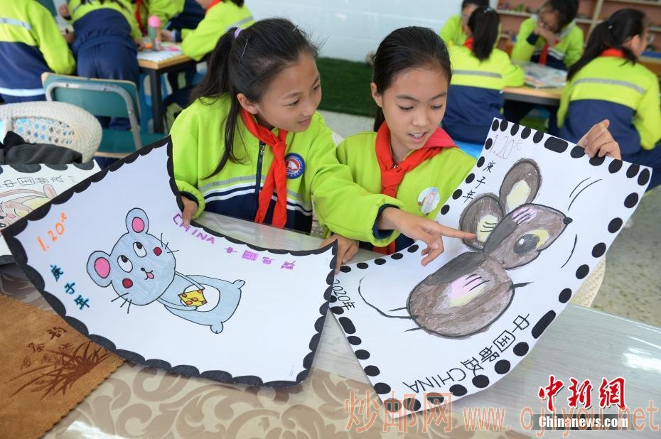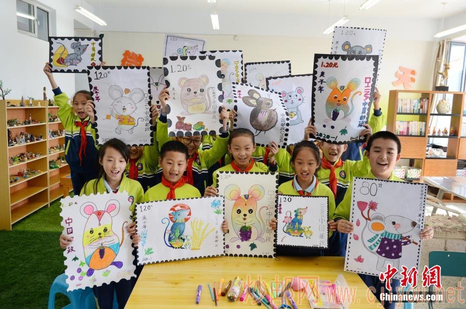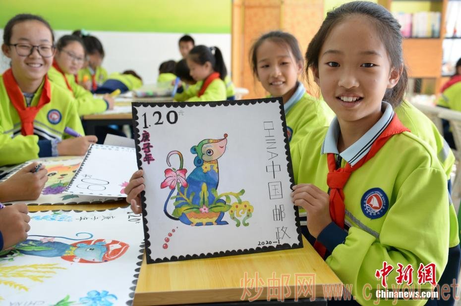 10月8日,小学生展示绘制的生肖图案邮票。当日,内蒙古自治区呼和浩特市玉泉区通顺街小学开展“生肖邮票文化创意设计”活动,学生们在课堂上手绘中国生肖图案邮票,了解邮票的文化内涵和世界邮政发展历程,迎接世界邮政日的到来。中新社记者 刘文华 摄