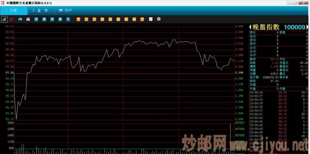 行情速递:今日晚盘指数涨幅1.16%,收于88.10点,成交额199万CNH。