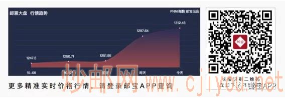 邮市大盘行情指数上涨,今日最新指数点1312.45,昨日指数1297.64点,上涨14.81点,涨幅1.14%,具体邮票品种的价格变化在下文中一一列出。