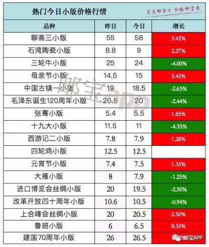 建国70周年小型张今日最新价格为8.5元,昨日价格为7.8元,涨幅8.97%