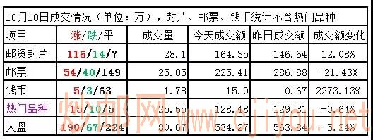 邮票板块:小幅收涨,小部分品种有积极表现,但整体仍不活跃。人大、黄龙等少数活跃品种,小幅收涨,柳毅加标、亚展小版、漓江、国旗等不同程度收跌,表现较弱。边陲风光、猪小版、火炬不干胶小版、三国五小型张等大买盘支撑,不同程度收涨,表现较好。07石涛作品、海底世界、鸡小版、九寨沟等品种有买盘大单支撑。