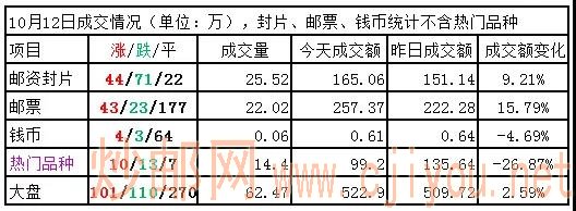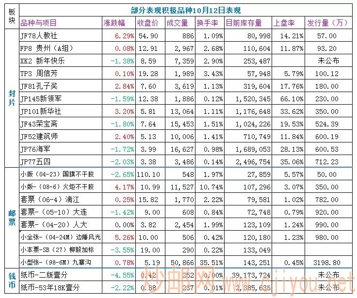 邮票板块:指数小幅收涨,但整体活跃度不高,弱势震荡状态。活跃品种中邮政银行、漓江、九寨沟、火炬不干胶小版等,小幅收涨,表现抗跌,亚展小版、柳毅加标、大连、国旗等小幅收跌,表现较弱。边陲风光、鸟巢、火炬不干胶小版、崂山等,有较大买单支撑。
