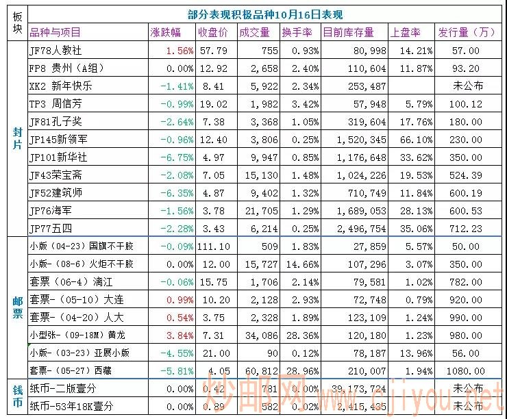 昨天挂牌的人口普查、工业展览、食用菌、中葡声明等,继续上涨,买盘积极,涨幅居前,表现较好。其他积极买盘支撑的品种如新品种的医学、世界法律、苏州等,旧品中的人教社、二炮、农业普查、巫山小三峡等。新品种中的华商、北京图书馆、科协第三次代表大会等跌幅居前,表现较差。