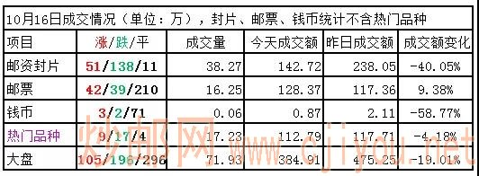 邮票板块:微跌,弱势依旧,活跃品种同样表现不佳,部分品种有大单支撑。热门品种延续弱势,大多下跌,仅马鹿、黄龙、大连、人大等收涨,且买盘消极。人民大会堂小本票、套票建国60周年、石涛作品、建党八十周年小版、火炬不干胶小版等,有积极买盘,不同程度收涨,表现稍积极。