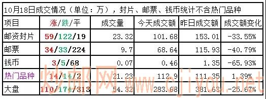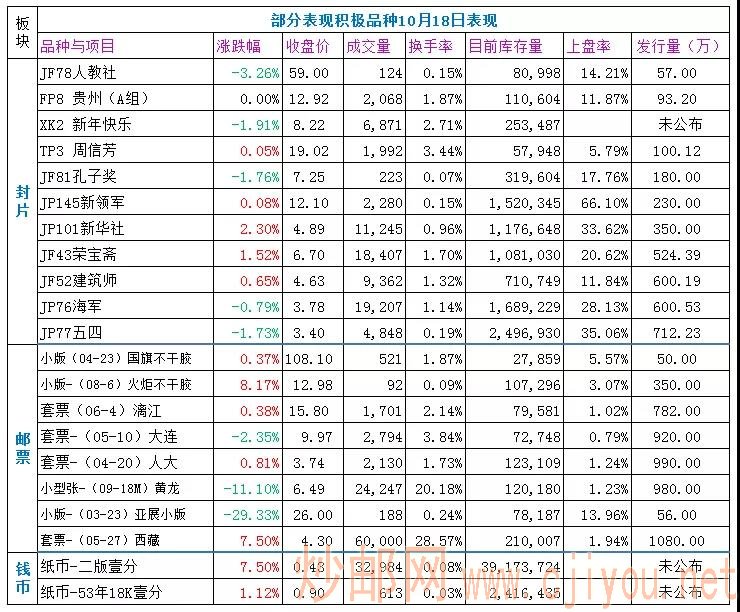 新品种奥运、北方、西湖等,以及出现买盘抵抗的俄罗斯年、社科院、农业普查、世界物理年等老品种,涨幅居前,表现抗跌。其他有积极买盘支撑的品种如贵州(A组)、周信芳、开平碉楼等。已经连涨3天的新品青少年、人口普查、地理等卖盘较重,跌幅居前,表现较差。