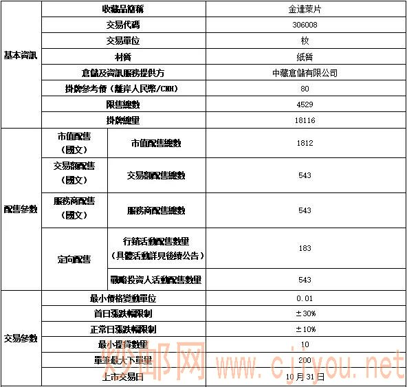 經中國國際文化產權交易所有限公司(以下稱本所)交易商及合作平臺共同申請,《金達萊片》收藏品已入庫至本所指定的第三方倉儲公司,現准予在本所白盤正式掛牌交易,具體事項公告如下: