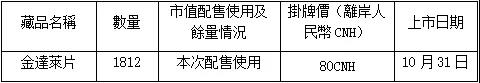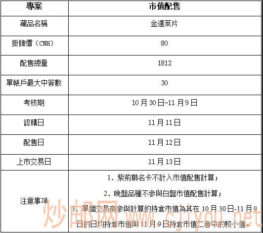 本所將於11月12日收盤後辦理認購配售貨款劃撥及藏品認購配售到賬,11月13日可進行交易,本次認購以交易商最終認購得到藏品掛牌市值按0.3%收取認購手續費。