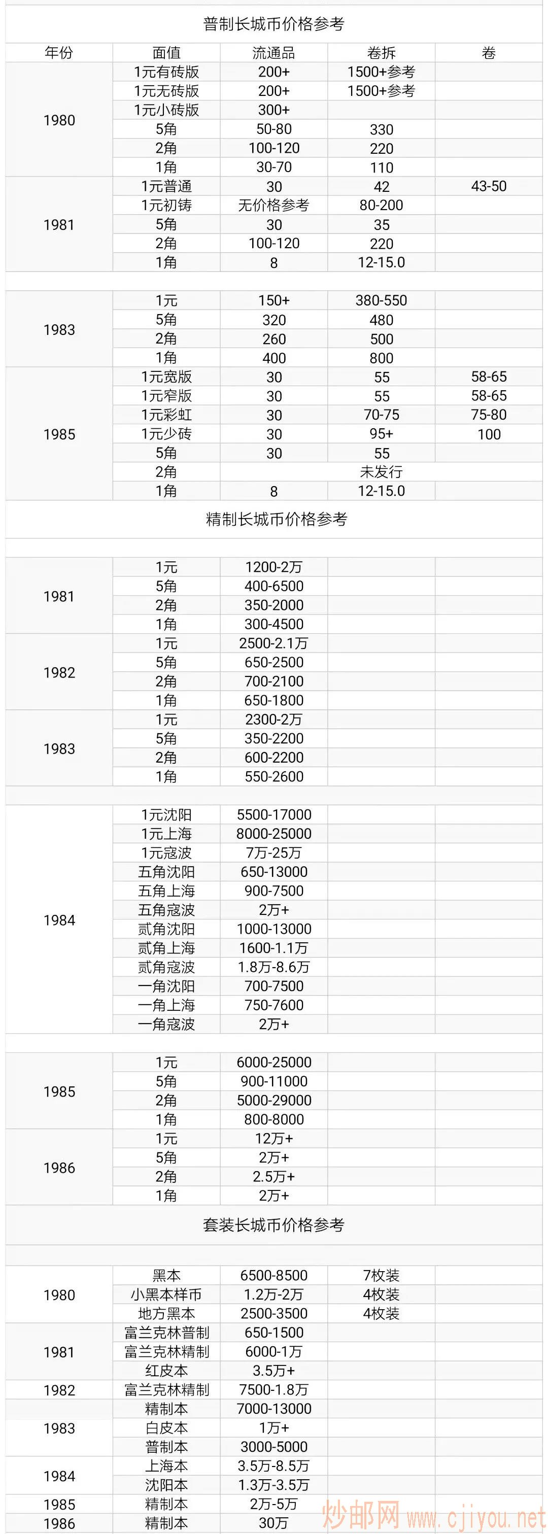 另外市场常见到一种1981年7枚套装流通币,外包装与沈阳造币厂生产的1980年版长城套币一样。套装币都应为精制币,而此套币却为普制币;另外此套币包装的明明是1981年币,但是此币的年份说明此套币却标着1980年。以上套币极难集全,精制套装币大全套参考价:40000元以上。另附发行量:80年8万,81年2.34万,84年0.575万, 85年0.4825万,86年0.0660万, 82、83不详。长城流通散币在400万——460万之间。