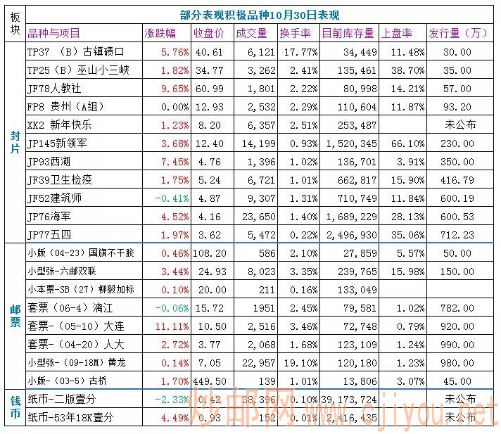 板块216个品种,涨跌平比184/18/14,涨幅超10%的品种30个,最大涨幅为JF66科技活动周39.1%,跌幅超5%品种4个,最大跌幅为JP5联合国-9.06%,3元以下品种42个,较昨天减少11个,板块内最低价为JP40洞穴2.73元,比昨天的最低价上涨0.07元,板块整体重心中幅上移。