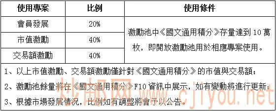 2019(交)第480號 關於推出“《國文通用積分》激勵池”的公告 日期:2019-10-31 尊敬的交易商:為維護市場健康發展,建立健全《國文通用積分》體系,經本所研究決定,現推出《國文通用積分》激勵池,詳情如下:即日起至2020年4月30日,《國文通用積分》仍將不會新產生,同時各方面消耗的《國文通用積分》將不再銷毀,統一存放於激勵池中,用於會員發展、市值激勵、交易額激勵等活動使用,分配比例安排如下: 市值激勵與交易額激勵考核週期原則上為前一次開放激勵池獎勵至當次開放激勵池獎勵期間(首次考核週期為11月1日(含當日)至首次開放激勵池獎勵(含當日)期間),詳見後續公告。 中國國際文化產權交易所 2019年10月31日