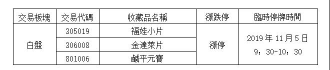下列收藏品於2019年11月1日、11月2日、11月4日連續三個交易日價格漲停,根據中國國際文化產權交易所《風險控制管理辦法》等規定,屬於收藏品價格異常波動,本所將對下列收藏品採取停牌控制措施。具體停牌資訊如下: