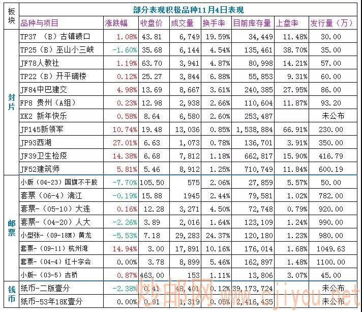 板块216个品种,涨跌平比173/29/14,涨幅超10%的品种39个,最大涨幅为YJ1世界邮展29.54%,跌幅超5%品种5个,最大跌幅为图联-7.73%,3元以下品种18个,较上周五减少19个,板块内最低价为少先队2.9元,比上周五的最低价上涨0.1元,板块整体重心中幅上移。
