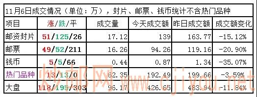 邮票板块:微跌,弱势震荡,成交不活跃。大连、邮政银行、六邮双联等少数几个品种有一定活跃度,小幅收涨,有积极表现。鸡小本、春节小型张、牡丹双联、边陲风光、中国梦(二)等有较大买单支撑。