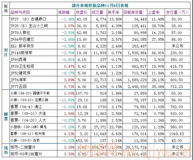 JP6抗战、JP8工业、中科院、解放军报、巫山小三峡、荣宝斋等,买盘积极,涨幅居前,表现较好。武汉东湖、工业展览、科技活动周等,跌幅居前,表现较差。