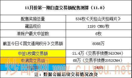 本次交易额配售活动仅剩3个交易日。截至目前,中签1枚现价1193CNH的《天柱山天柱峰片》仅需342CNH手续费,收益率高达248%!!!