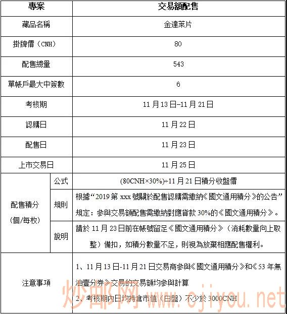 本所將於11月23日收盤後辦理認購配售貨款劃撥、配售積分扣除及藏品認購配售到賬業務,配售到賬藏品11月25日可進行交易,本次認購以交易商最終認購得到藏品掛牌市值按0.3%收取認購手續費。