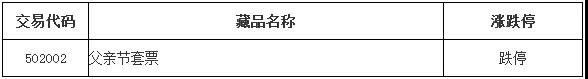 2019年(风)708号父亲节套票停牌公告 日期:2019-11-15 下列藏品于2019年11月13日、11月14日、11月15日连续三个交易日价格波动异常: 根据香港环球文化艺术产权交易中心《风险管理规则》等规定,属于收藏品价格异常波动。经本中心研究决定,自2019年11月16日9时30分起暂停以上藏品交易,于2019年11月16日10时30分起恢复交易。本中心提醒广大交易会员谨慎投资,注意风险。特此公告 香港环球文化艺术产权交易中心 2019年11月15日