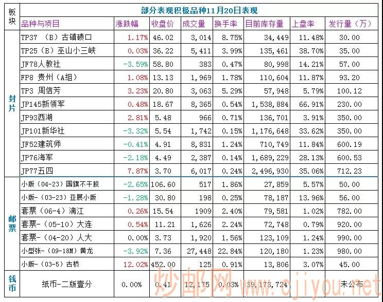 平台晚间公告,有7个邮票、4个封片和2个钱币的再寄存上盘,无论从品种数量还是从上盘数量来说都比前期明显增多,如JP121心理学增加9万多,XK2新年快乐增加6.7万左右等,整体而言与本周供给减少的预期不符,难怪行情未见好转。有一点需要看到的是被提货的品种越来越多,主要以邮票为主,钱币也不少,封片只有一个园艺会。