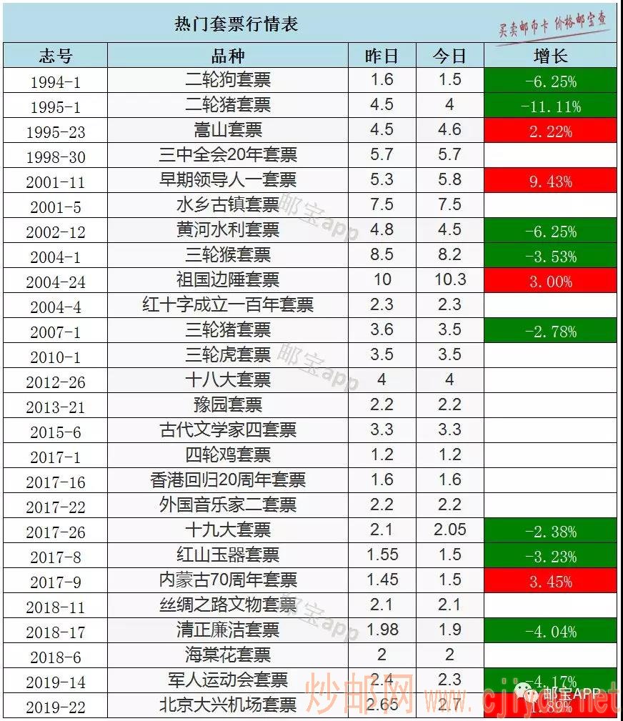 二轮猪套票今日最新价格为4元,昨日价格为4.5元,下跌11.11%。二轮狗套票今日最新价格为1.5元,昨日价格为1.6元,下跌6.25%。