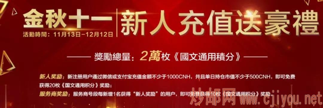 新人奖励:新用户开户并通过微信或支付充值1000CNH以上,且单日持仓市值不少于500CNH,即可免费获得20枚《国文通用积分》!