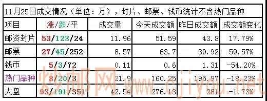 大盘:在本周上盘量将大增的压力下,继续下跌,延续弱势,今天下跌主力依然来自相对活跃的封片板块。平台拢货进展较为顺利,做大做强的战略持续推进,成为最大邮币投资平台几无悬念,对拿到牌照也越来越有利,未来的行情也值得期待。但就目前而言,新增资金迟迟不见增长,而上盘供给却频频增加,使得市场疲弱不堪,投资者悲观恐惧情绪愈加严重。根据上周五公告明天将有107个新品挂牌交易,86个邮票16个封片5个钱币,明后天市场表现引人注目,前期低点是否会跌破,是否会有资金抄底?
