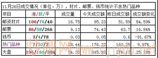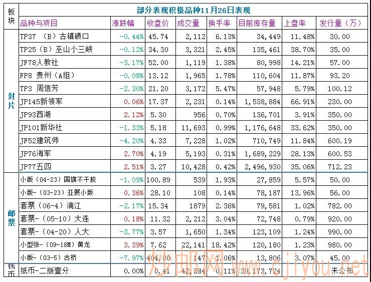 邮票板块:微跌,延续低迷状态。黄龙、石涛作品、一轮虎、金铜佛造像、亚展小版、三孔等,有一定买盘支撑,小幅收涨。猪小版、鸡小本、猴赠送、聊斋一等,有较大买单支撑。