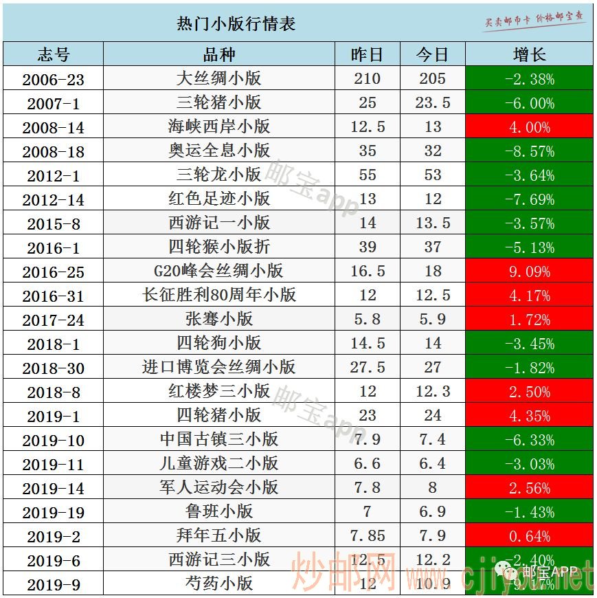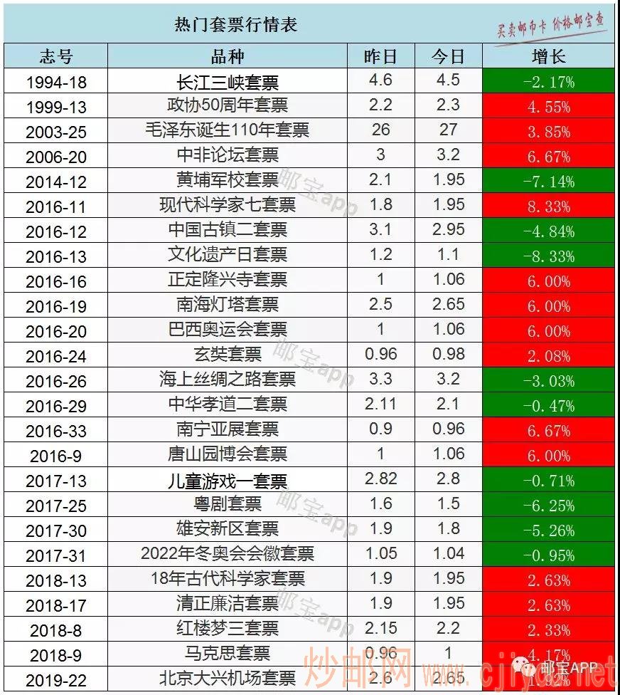 巴西奥运会套票今日最新价格为1.06元,昨日价格为1元,上涨6%。文化遗产日套票今日最新价格为1.1元,昨日价格为1.2元,下跌8.33%。