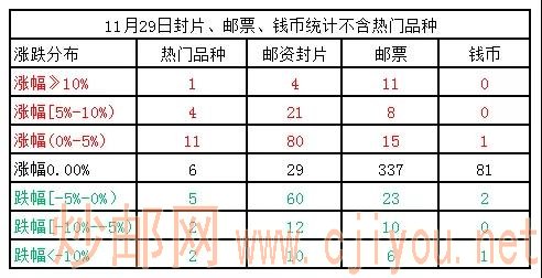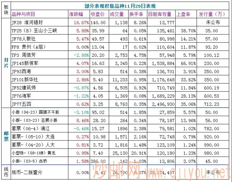 淮河错封、丹东风光、JP49邮展、光明日报、JF32新华社等,买盘积极,涨幅居前,表现较好。采矿、水运会、五项原则等跌幅居前,表现较差。