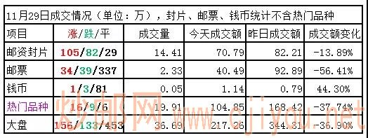 邮票板块:微跌,整体持续低迷。一轮虎、亚展小版、马鹿、古桥、黄龙等,买盘支撑,反弹稍积极。三孔小全张、云冈石窟、猴赠送小版、水浒传五小型张、三国五等有较大买盘挂单。
