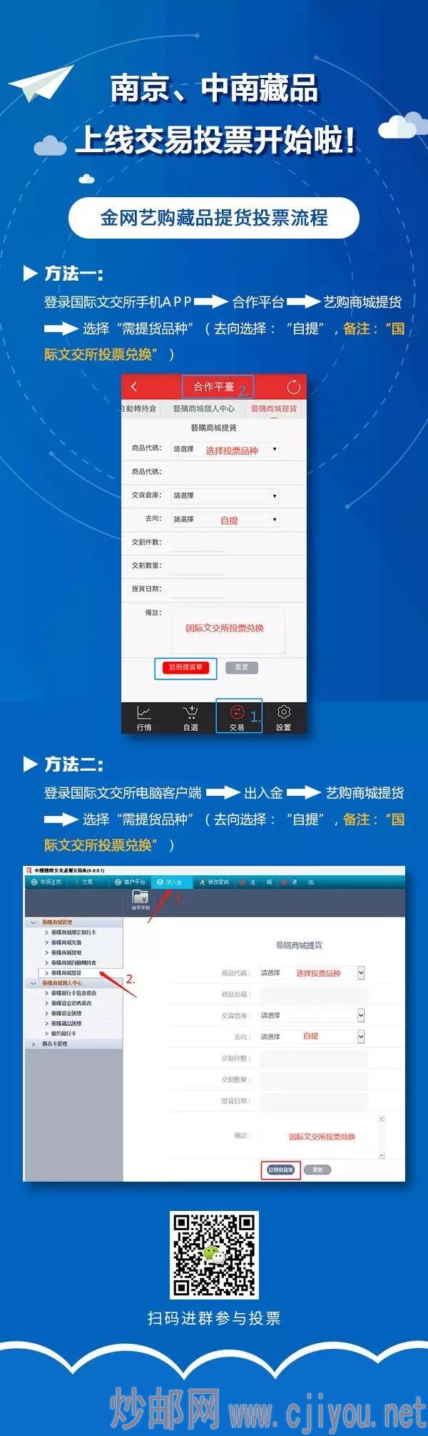 方式一:登录国际文交所电脑客户端→出入金→艺购商城提货→选择“需提货品种”(去向选择:“自提”,备注:“国际文交所投票兑换”)