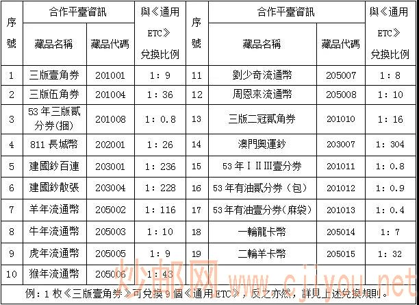 7、各藏品可以根据下方表格中的兑换比例兑换相应数量的《通用ETC》。