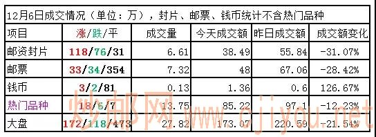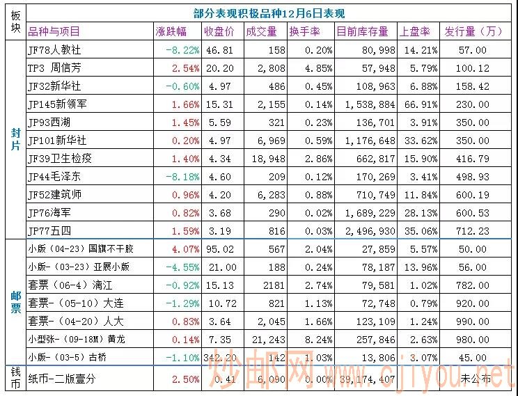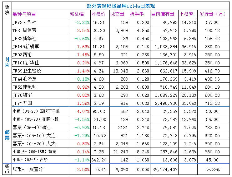 邮票板块:小幅上涨,试探反弹,成交仍低迷。足球小全张、亚展小版、西藏、朱仙镇、苏州工业园等有一定买盘支撑,相对抗跌。三国五、浦东小型张、边陲分光等有较大买单支撑。