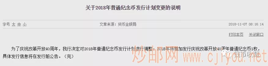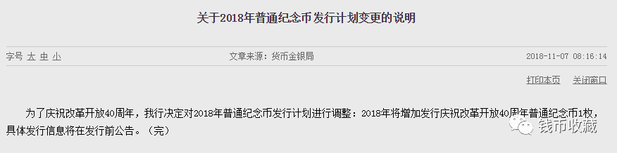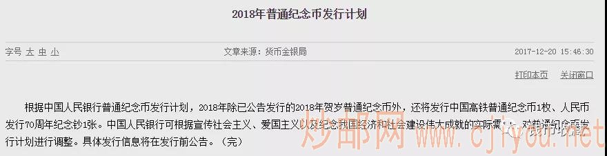 2018年公告在2017年的12月20日公布,发行二狗币,高铁币,70周年纪念钞。11月7日,增加发行改革开放40周年纪念币。70钞是去年的爆款,面值50元,发行量1.2亿,现在价格是75元左右。