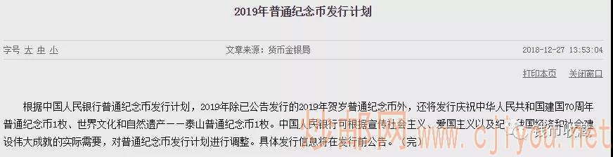 2018年12月27日发行计划发布,二猪币,建国70币,泰山币,三个纪念币完成了今年的发行计划。