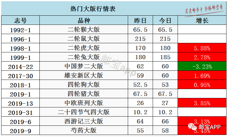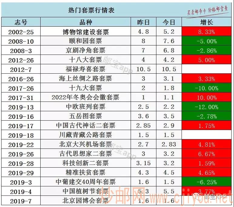 十九大套票今日最新价格为1.8元,昨日价格为2元,下跌10%。