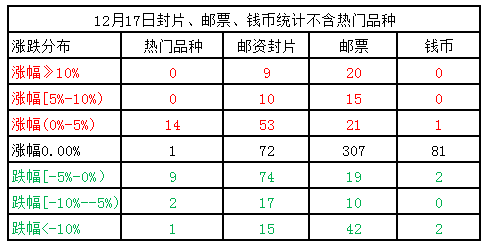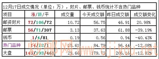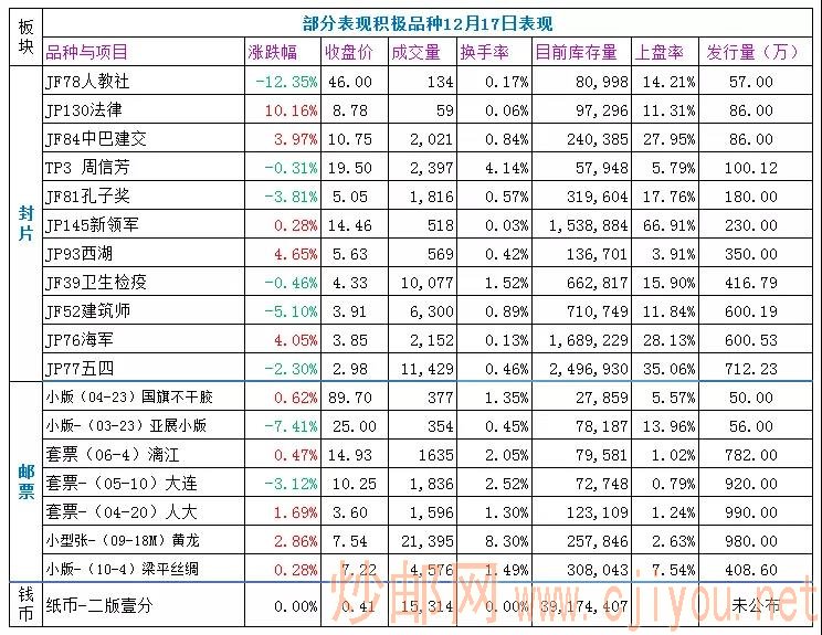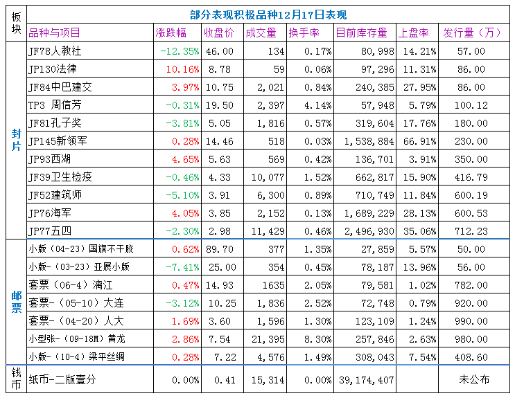 大盘:缩量微跌,延续弱势,领跌的仍是邮票指数,因买盘稀少出现近30个品种暴跌80%以上,还都是收盘价为0.41元,这估计是某种无奈的情绪表达。封片板块在12个新品上盘压力下再度转弱,钱币持续低位弱势震荡。上行无力,下跌也动力不强。