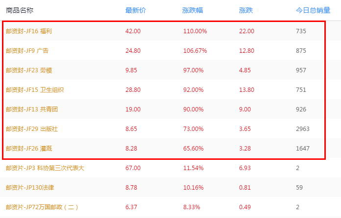 今天挂牌14个品种,12个封片和2个邮票。12个封片涨跌比为7:5,7个大涨的早期邮资封,特点:大多发行距今近30年,发行量都低于100万,上盘量较少。5个大跌的邮资片,特点:发行距今较近,发行量大多在100万以上,上盘数量相对较多。2个邮票品种均大幅下跌。下图是7个邮资封的上涨情况。