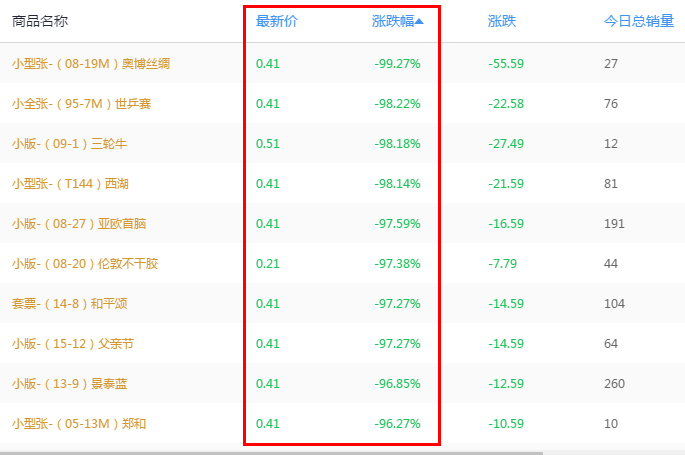 邮票板块:小幅下跌,继续领跌。跌幅居前的31个品种中有27个收盘价为0.41元,且跌幅基本都在79%以上,较昨天有蔓延之势。梁平丝绸、漳州年画、二轮鼠、边陲风光、李可染作品、牡丹双联等有一定买盘支撑。