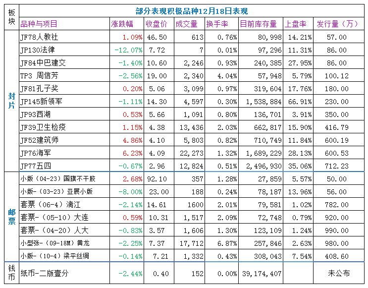 从晚间公告看,库存量增加的品种有10个,增量最多的是套票八届人大,新增7.2万,封片中增加最多的是YJ1世界邮展,仅增加5万,总体增加较少,地量增加。同时还有47个品种数量减少,不同程度被提货。被提货的基本都是邮票,这次没有封片。