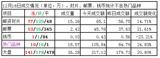 邮票板块:微跌,持续弱势,成交低迷,但今天出现暴跌的品种明显减少。宋词、六邮双联、凤翔丝绸、海底世界、梁平丝绸、西游记、二轮虎、坐具、漳州年画、五邮、红楼梦等有一定买盘支撑。