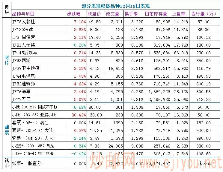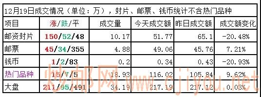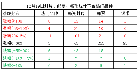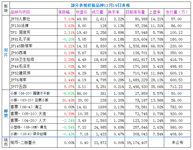 邮票板块:微涨,弱反弹,盘面仍较清淡。大连、亚展小版、西藏、清明上河图、牡丹双联、八仙过海等,有一定买盘支撑,小幅收涨,近期整体价格较稳。神州飞船小版、海底世界、边陲风光等有较大买盘挂单。