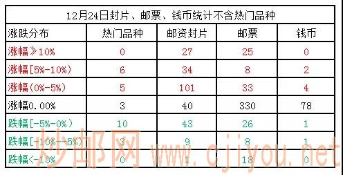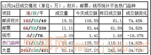 今天共有19个品种挂牌,其中邮票14个,封片5个。邮票表现不佳,成交清淡,5个封片均较活跃,涨幅较大,发行量均低于100万,上盘量也较少。下表是5个封片的表现情况。