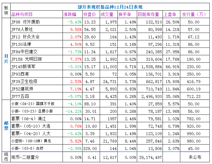 人教社、光明日报、JF16福利、JP12青少年、观光年、科技产业等,有一定积极买盘,涨幅居前,表现较好。JP102足球、万国邮政(三)、中英等,跌幅居前,表现较差。