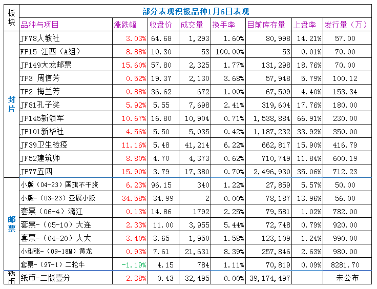 大龙邮票、卫生检疫、新领军、YJ1世界邮展、中央电视台、五四、孔子奖等,均有较多积极买盘,涨幅居前,表现较好。中国民航、香港基本法、JF32新华社等,跌幅居前,表现较差。