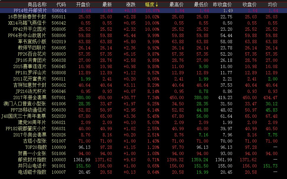 今日环球综合指数微涨3.06点,涨幅0.04%,收报7826.76点。分类指数,邮资封片小幅上升,TOP20、港澳邮票、缩量普片、电话磁卡微涨,邮票型张、金银纸币微跌。涨幅榜方面,蛇形大运错封连涨多日后获利资金砸盘,下跌调整。牡丹邮资片开盘高抛上攻,买卖交投小幅成交,延续至午盘涨停收尾。孙中山故居片、草书宣纸早盘上攻,拉涨封停,短暂下调后重启上行走势。共青团片开盘小幅上升,大单量成交,尾盘上攻走高,延续涨势。喜事连连片早盘红线上下方宽幅震荡,买卖差价较大、博弈激烈,高位收红。成交活跃度方面,红楼梦小型张、香港终审法院继续放量成交微涨收红。低价活跃品自创鸡百片、53年一分券、长征胜利80周年、荧光猴白片等,保持交投活跃,平稳运行之势,或横盘或微涨收尾。唐诗、三轮羊、三国五、三轮虎、红楼梦小版等午盘放量成交,微涨收红稳健运行。香港猴、澳门海事、香港抗战、木兰辞套票等继续保持放量稳定成交。今日盘面延续昨日微涨升势,版块多数上升,个品上涨增多,带动大盘微涨收红。目前环球盘面走势稳定,整体趋势逐步向上,低位加仓耐心持有以待后市盈利。